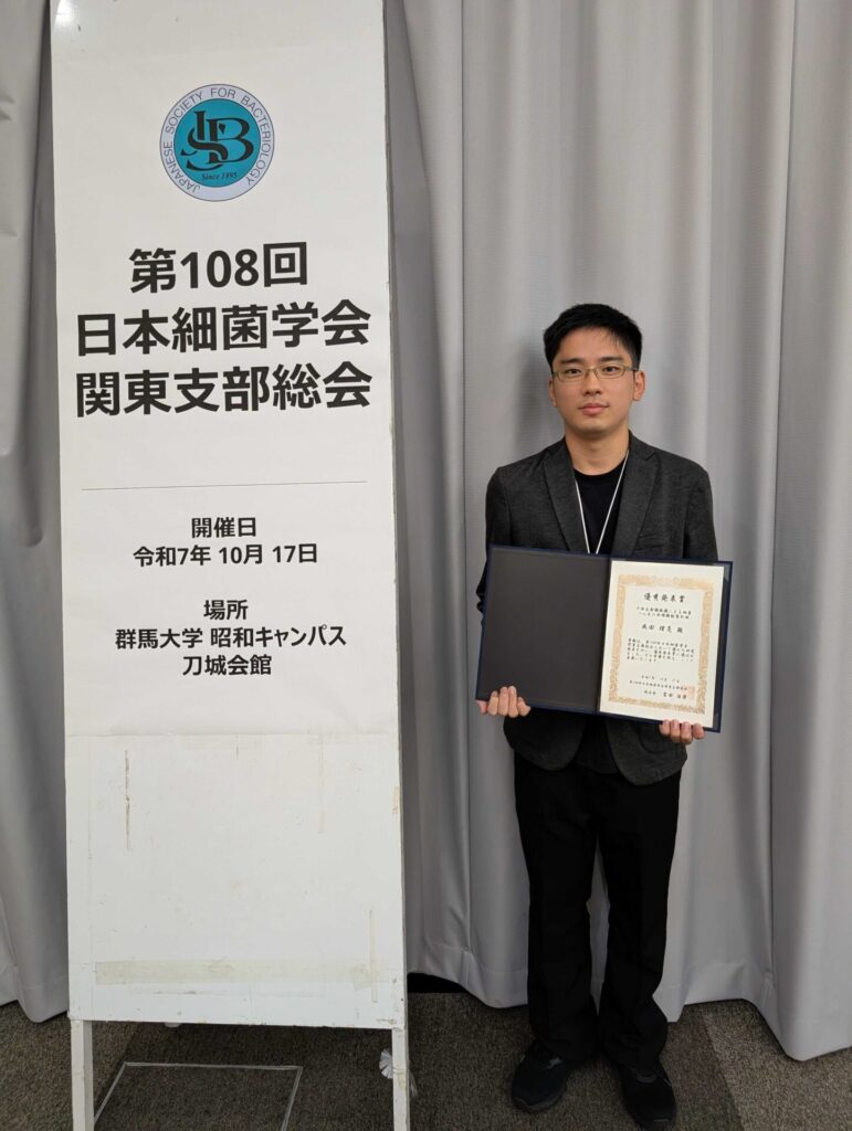 2025年10月17日に群馬大学 昭和キャンパスで開催された第108回日本細菌学会関東支部総会において、中根研M2の成田理亮さんが優秀発表賞を受賞しました。評価してくださったみなさま、ありがとうございます。